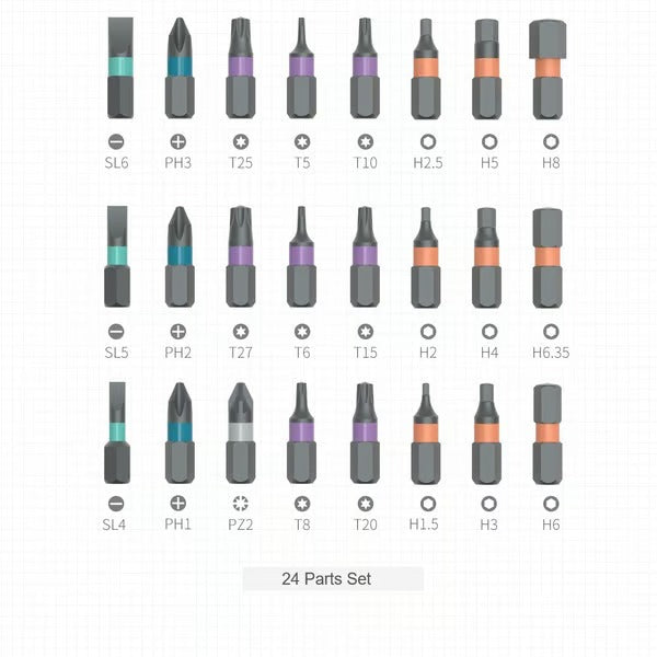 O kit inclui 24 pontas e acessórios diferentes e intercambiáveis, ideais para todos os tipos de reparações e para todos os tipos de pessoas.